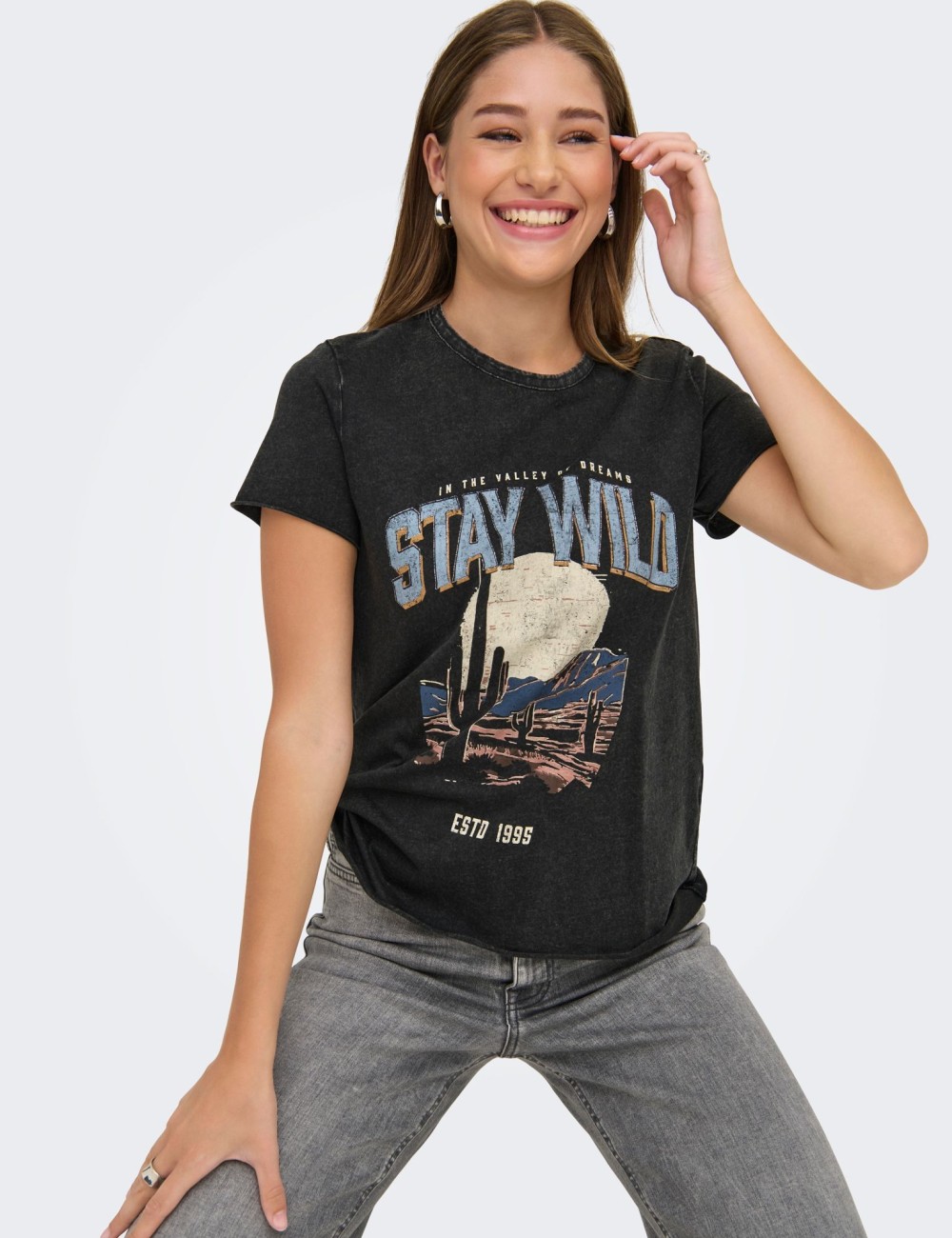 Camisetas con dibujos del oeste , cuello redondo y mangas y bajos con corte tijera.