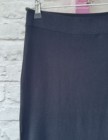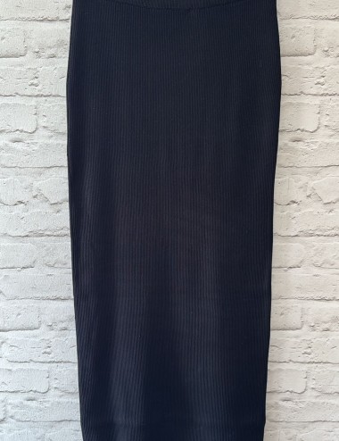 Falda larga ajustada y elástica en punto canelé, color negro. Cinturilla ancha, goma interior. Básic para jerseys de punto y sudaderas muy top.
