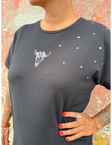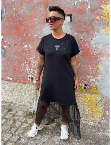 Vestido negro largo midi, manga corta y cuello redondo. Detalle bajo en plumeti y logo bordado en pecho. Tachitas en hombro derecho. Un basic para todo. La sudadera rosa de la misma marca le queda genial. os la dejo en productos relacionados.