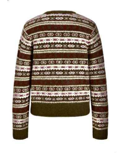 Jersey punto jacquard en tonos verde/burdeos de cuello redondo y manga larga. Tacto suave y muy amorosiño. Largo cadera. Chulada!!