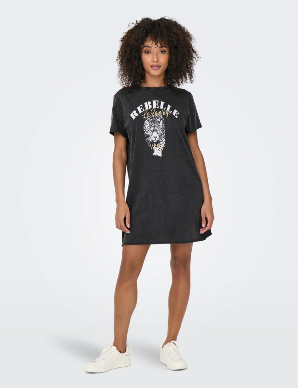 Vestido algodón fluido, manga corta y largo por encima de la rodilla con print en pecho leopardo "Rebelle" Un básico ideal para playa, terraceo.. Incluso con un palazzo por debajo hace un look realmente chulo. Color: Negro vintage.